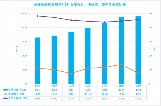 2.10 儀器儀表行業(yè)歷年1-9月負(fù)債合計(jì)、增長率、資產(chǎn)負(fù)債率比較