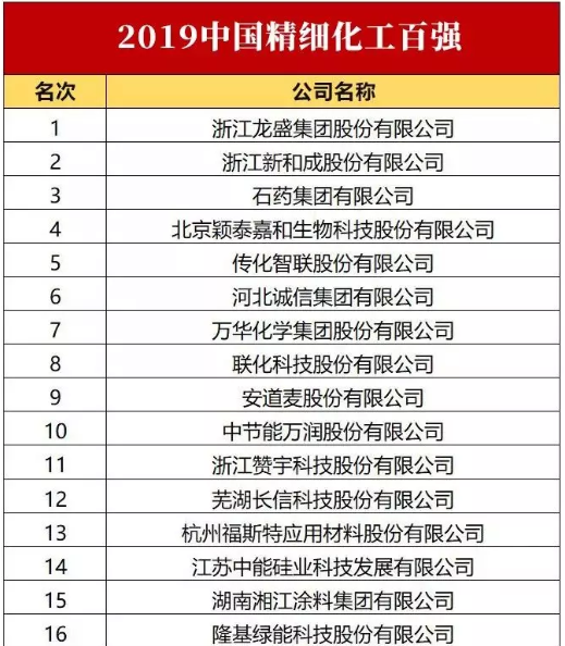 2019中國精細化工百強名單