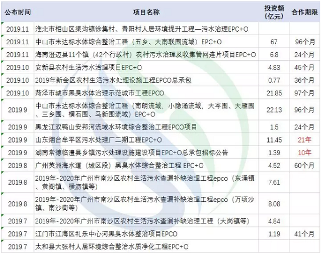 到了近期,更多地區(qū)水環(huán)境項(xiàng)目以“EPCO(設(shè)計(jì)-采購(gòu)-施工-運(yùn)營(yíng))”的模式被釋放了出來(lái)。EPCO模式是在EPC模式基礎(chǔ)上的創(chuàng)新,將EPC項(xiàng)目總包后的運(yùn)營(yíng)環(huán)節(jié)一并打包。在同一主體下,之間形成配套,從而規(guī)避了不同主體銜接造成的資源浪費(fèi)及效率損失。