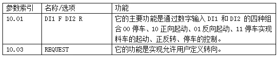高爐上料計算機控制系統(tǒng)是由一套施耐德Quantum PLC控制的。料車的控制分為自動和手動兩種方式,自動由PLC完成,手動由操作箱完成。由于上料小車是一個重載負荷系統(tǒng),考慮到控制的安全性問題,在設(shè)計中采用通過電纜一對一信號傳輸控制,PLC輸出兩個正、反向運行數(shù)字信號I0.1、I0.2以及手動開關(guān)信號通過控制選擇,通過必要的保護聯(lián)鎖后,連接到變頻器的DI1和DI2兩個輸入點,完成變頻器的起動、正反轉(zhuǎn)、停車的控制。在完成了外部連線后必須對變頻器內(nèi)部相應(yīng)參數(shù)進行設(shè)置,主要設(shè)置參數(shù)如表2: