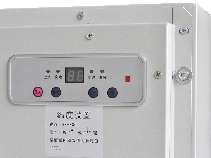 空調(diào)器內(nèi)循環(huán)的風(fēng)扇從上部吸入熱空氣,使空氣不斷通過蒸發(fā)器的翅片進(jìn)行熱交換,并將放熱后變冷的空氣從下部排出空調(diào)器,并送向柜內(nèi)。如此柜內(nèi)空氣不斷循環(huán)流動,達(dá)到降低溫度的目的。同時(shí),外部循環(huán)的風(fēng)扇從下部吸入外界冷空氣,經(jīng)過熱交換后熱空氣從上部排出空調(diào)器。